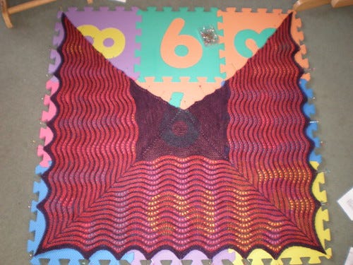When I got back from SkipNorth I finished and blocked the 3/4 Hap Shawl.