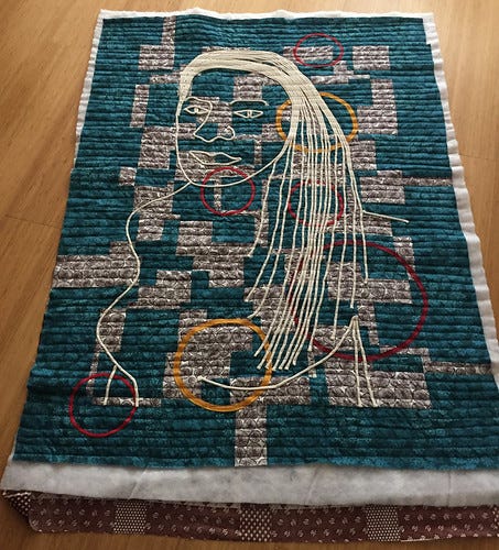 I went totally nuts and used my twin needle for the first time in my life and after having got one with each of the three sewing machines that preceded this one. It still seemed to be lacking something so I decided to embroider it. A small self portrait, bottom left, I thought, based on the photo Roc just took of me (in my previous post). More auditioning of thread. I decided on the clothesline, obvs, which is a bit too thick to embroider with SO...