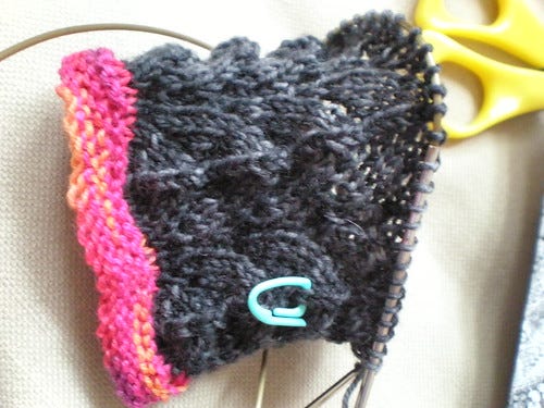 The colours are very hard to photograph but it is neither so garish or gothic as it looks. Plus it is certainly knitting up quickly. I've made a couple of mods which I'll write up on Rav.