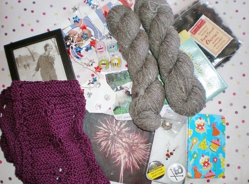 I was terribly lucky! It actually arrived on my birthday too although the post office held it until the saturday. I love everything and if I weren't so warm the scarf would by now have been put to extensive use. Roll on winter! Except, you know, in November.