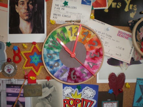 The heat means I've only done a few rows of knitting at the end of the evening when it really has cooled down. So the pop spots shawl continues slowly. I've been working on smaller projects instead that don't need to sit in your lap. So the french knot clock face is now in residence!