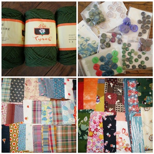 850g of the green yarn for 500Yen (about £3.50), oodles upon oodles of buttons, drawers of fabric remnants (left) and handkerchiefs or wrapping cloths (right) - these are just what I brought home which barely dented the surface of what was there. There were much larger lengths of fabric too.