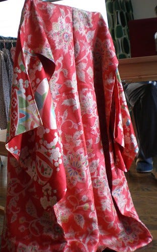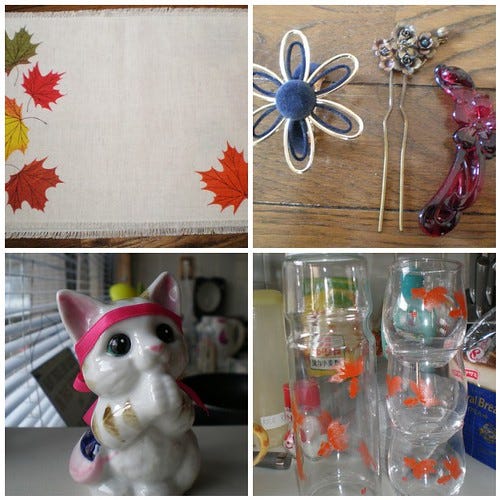 Unused vintage placemats with this lovely maple leaf design, random hair clips, 'thank you' cat and a juice flask and glasses still in their original box. My favourite item though is this lovely vintage kimono jacket.