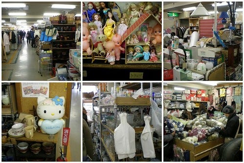 This is not your average UK style charity shop - but much more like the american thrift stores. It was huge. Epic. Vast. There were leaflets in english at the door telling you how it all works but essentially about 10% of the stuff was priced, the rest was a guess. And then whatever it said on the label, they'd knock up to half off when you came to pay. You see the bottom right photo in the medley? That was the haberdashery and vintage kimono section. Mmmm.