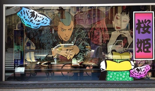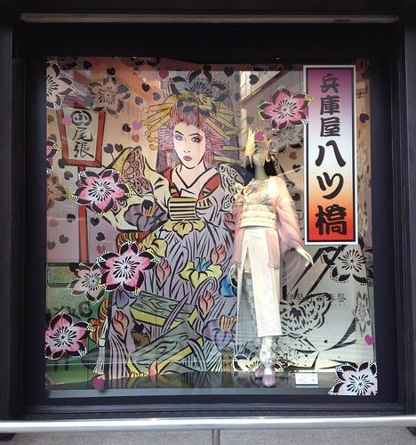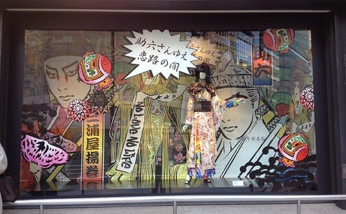 Moving on I admired the contrast of old culture (kimonos and kabuki make-up) with new culture (comics and manga - although comics are also a little bit old school having now been around for decades) and very new culture (the cutting edge fashion).