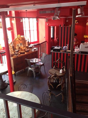 The shop contains examples of their fantasy cakes. The cafe upstairs is like somewhere vampiric, chocolate-loving, ladies-who-lunch would hang out.