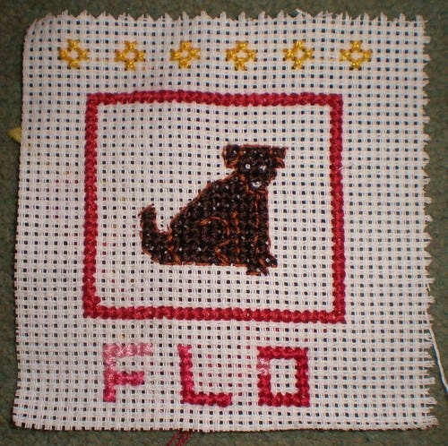 She got back to find me knitting. What else. She asked me about cross-stitch. "Is it difficult? Could I do it?" Never ask an enabler if you can do something. Thirty seconds later she had aida, threads and a pattern of a dog that looks like her dog.