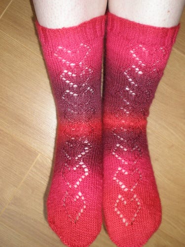 When I got back I started swatching in various patterns. By swatching I mean I cast on since this was going to be a fairly plain V shawl so it made sense to do the swatches like that. I did this four times. Ripple in 4x4 stripe with garter row, ripple in 2x2 stripe, 2x2 plain stripe, 4x4 plain stripe. It wasn't working. So I switched tactic and looked for shawls previously knit in Zauberball that looked good. I settled on Whippoorwill. Thing is though - in the large size you've got 500+ stitches on the needles. Zauberball is meant to make nice socks at 60-70 st per row. At that row length the colours gradually fade between one and the next. At 500 st you basically get stripes. The samples I'd looked at that looked nice were the small sizes and I was knitting the largest one. There's a life lesson there. Meh. Photos to come.