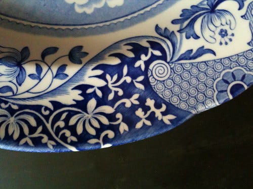 Not only am I returning to something that is broken, I have also converted the pattern to knit in the round so as I fix myself my knitting also revolves. As I knit I have been thinking about my next project, which I hope will be something that has been inspired by being down here at my Mums. She has a collection of Spode and other blue and white china. As I have eaten from these plates and bowls during the past few weeks I have grown more aware of the patterns, and the way they might translate into fairisle.