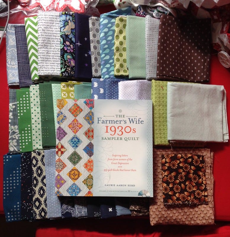 Finally I said a few posts ago that I was going to join the 30's Farmers Wife Sew-A-Long, and had a crazy idea I might do it in Liberty fabric. Yeah. A bit of surfing showed me prices and brought me to my senses. Mind you, I did then splurge somewhat on Etsy, and add a few long term stashed fabrics, to assemble this lot.