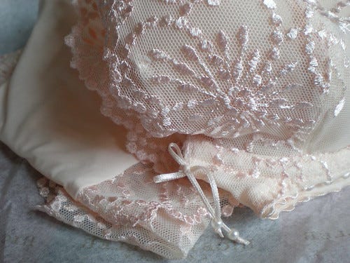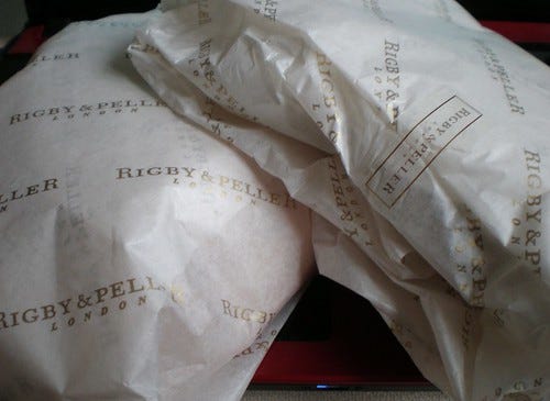 You have your own luxurious dressing room. A lovely woman brings you bras from special drawers in the perfect size for you and then puts them on you. She adjusts the straps and the way you are...filling...the cup and then you both inspect the result in the full length mirror. There is no pressure at all and once she knows what you like she goes and gets more beautiful bras and helps you try those on too. You make your choice and she then brings you a selection of matching knickers. Once you are all finished you are wafted back to the front desk and see your delicious purchases being carefully wrapped in crisp tissue paper. The transaction takes place and she hands over the cherry on the cake - the bag.