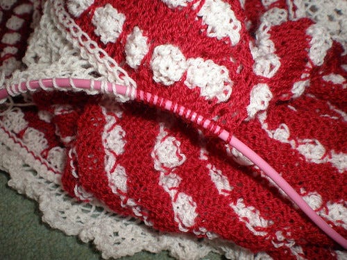 That wasn't even the half of it. The highlight for me was the jam I had with the scones which they had made themselves. Raspberry, and seriously the best jam I have ever had (hope Mater doesn't read this but it's true). Cucumber sandwiches, gossip, scandal and knitting - lovely! I took my Pop Spots along and since then am just one final repeat from finishing the border.