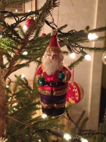 Yes, she does have the decorations my sister and I made as little ones. But she also has some more recent additions. The glass Father Christmas is one of my favourites.