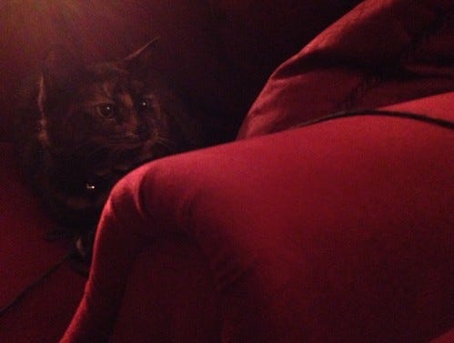I spent the weekend at Mum's getting over the last of my flu. I actually spent more than half the time I was there asleep but I guess that has helped since I was able to go back to work for almost a full day today. While down there I got some quality cat action. Artemis is not usually a playful cat - she prefers an actual kill to a pretend one with a screwed up piece of paper - but she noticed my knitting and the wool moving against the chair.