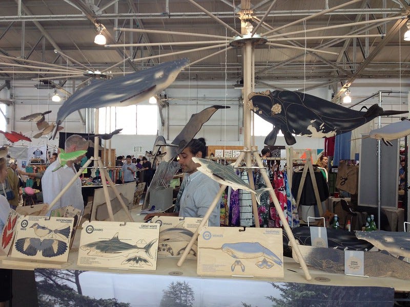 Pop out wooden sharks, whales and birds from Julio Carreon-Reyes.