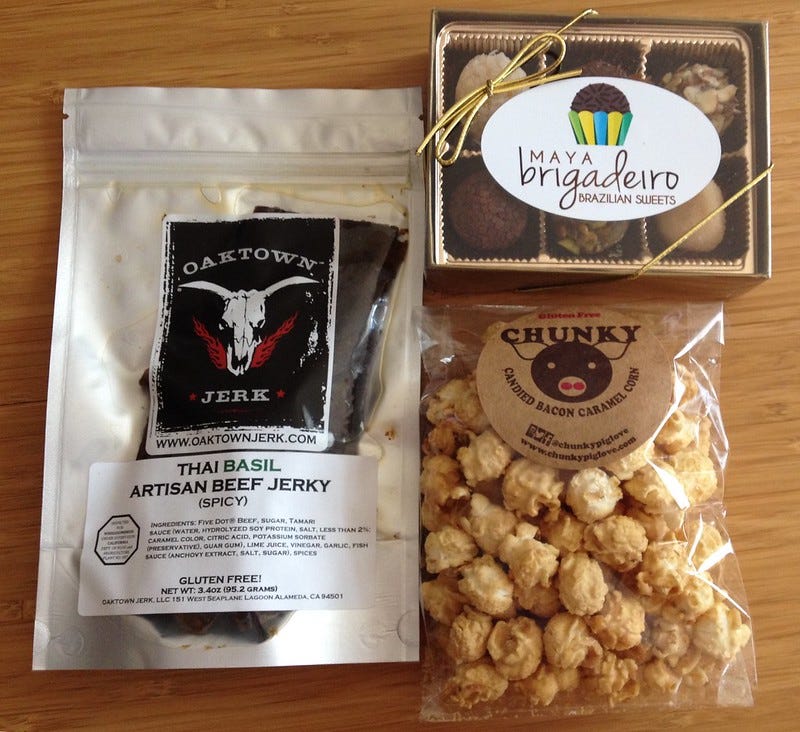 The jerky and Candied Bacon Caramel Popcorn are for Pooch while the Brazilian Chocolates (much more like fondant than french-style truffles) are to be "shared".