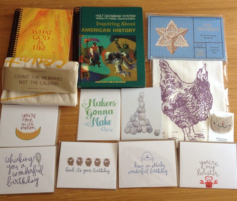 The spiral bound books are two of four I got from Ex Libris Anonymous who make notebooks out of old books. All four are going to be xmas presents. The cat brooch and the Makers Gonna Make postcards are from Migration Goods. The screen printed chicken is a tea towel and is from Rigel Stuhlmiller who is a local print maker. The 'count the calories' tea towel is from Nourishing Notes and was part of their food philosophy range. The Dual Tetrahedron is another laser cut and etched pop out thing that you assemble - due to be another xmas present - by Thomas Houha Designs. I also got some food.