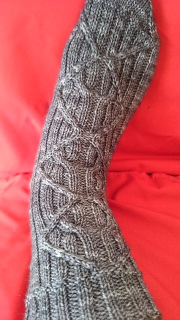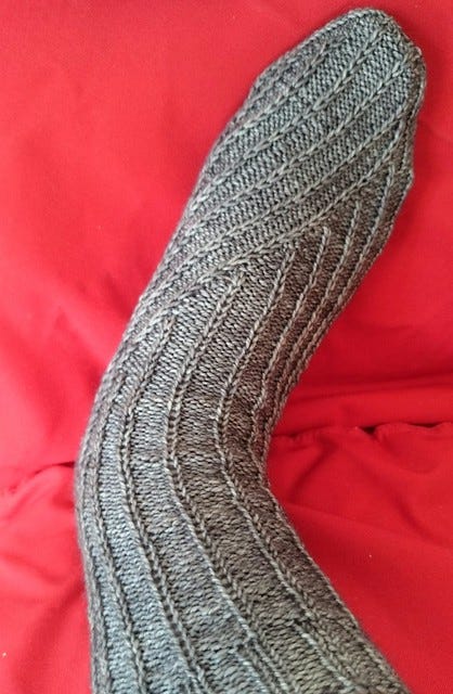 These are a free Knitty pattern called Twisted. I have had it queued since 2010 and finally got it going this year. I have only made one sock so far but they knit up quite easily with just knits, purls and slips.