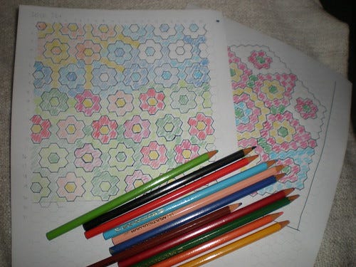 I am planning my entry for the Festival of Quilts competition. I'll be entering the miniature quilts section and doing tiny little paper pieced hexagons. I'm just deciding whether to go for a traditional pattern or something more pictorial.