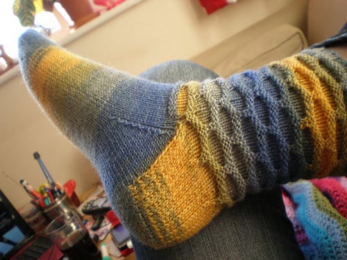 I do love how it has turned out. Which brings me onto a touchy point. I have not yet packed any other knitting to take down to Mater's. One sock is not going to last me five days.