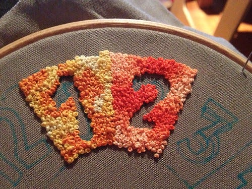 The colours are a little zingy in the photo but you get the idea. I've always adored the variegated DMC/anchor threads and can remember being given the occasional one as a present when I was a little mite. I now have quite a collection and while it's always tempting to leave them pristine it's always better to use them.The felt tip vanishes with water and is something I use on so many projects just because it's so darn useful. So once I've finished my rainbow circle of french knots all that will be left is the grey linen with the numbers in relief.