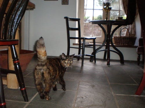 Slight pause in blogging there. I had another 'depressive episode'. Or in layman's terms - went a bit loopy for a bit. As a result I am now mid-med-change and having therapy again and so on. One of the silver linings of this particular black-dog-shaped-cloud is that I am spending weekends at Mater's. As an example of the joys of staying there here is the cat giving us the quintessential money shot.