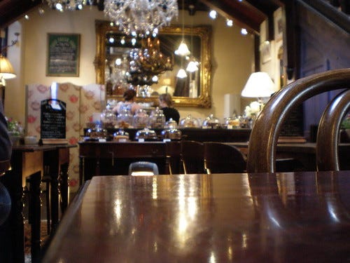 Inside, a staircase ran around what seemed to be the inside of the walls all the way to the ceiling. But then when you ventured up there were lots of tiny rooms all packed full of pretty fabric and kooky furniture. It felt like a house from Bramley Hedge. The coffee shop was very nice too and you should have seen the cake selection.