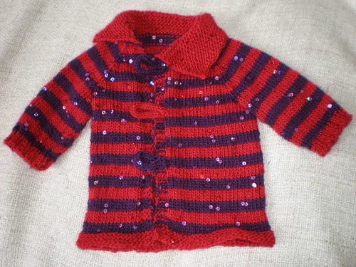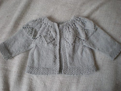 Neither have buttons yet. For someone who adores buttons so much I seem to have a terrible time sewing them on to clothes. I am thinking some little wired pearl ones for the Autumn cardi and some big red or purple ones on the Minx. Patterns are both free and are Autumn Leaves and the Easy Baby Cardigan which I've made before. On this one I put the fastenings over to one side and made them loops instead of ties.