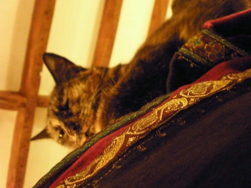 She has fads. Her latest is sitting on the backs of armchairs instead of anywhere flatter. This would be fine but she has awful balance. She wobbles back and forth like a ship at sea. And when she jumps down she jumps from the back to the arm and then to the floor. Except last time she kind of missed the arm and belly flopped to the ground. Dignity is not a friend to this cat.