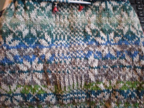 It's what I used for the quilt to keep all my hex's in before making them into flowers. I've decided this time to go smaller - a cushion cover. Meanwhile I have finished a present I can't show, cast on another I can't show and continued with my fairisle mashup. Cue blurry photo.