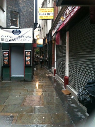 It was raining on Tuesday night so I decided to do a Gene Kelly and walk down to the river and get the boat home. It would have taken about half an hour to reach the pier if I had gone direct but I meandered and took twice as long. And I took photos. But only on my phone, so don't judge the quality.