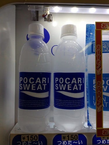 While looking for my first-past-the-post picture I found a couple of others I'd been meaning to share. When I wailed to Pooch that I had discovered Pepsi Max was not sold in Japan (SERIOUS issue, people) he told me maybe I'd take a liking for the sweat they drink instead. Sweat. I assumed he was joking.