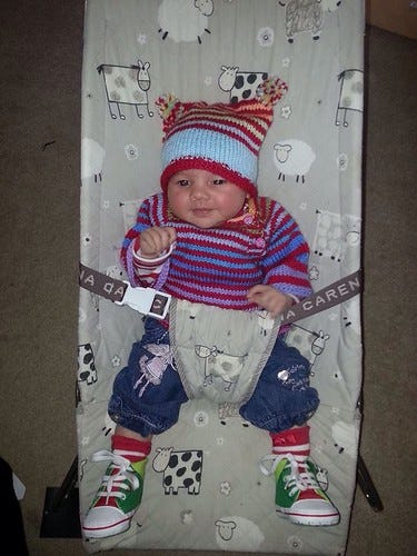 Pooch, you will not be surprised to hear, is not so good with babies. He likes children once they start doing stuff but until that point he is uneasy. It is fortunate I do not have a hankering for my own since Pooch would be a positive hindrance during the birth and during the first 18 months. He would need gas and air throughout. However, I do my ex-wifely duty by buying things on his behalf for the children of friends which he can then hand over. The kermit shoes are one of these items. My sister frequently talks about how they are her favourite item of Jasmine's wardrobe and how wonderful and thoughtful it was of Pooch while all the time I sit there hiding my tooth grinding behind my rictus of a smile.