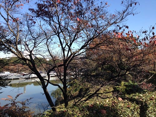 This temporary flat was provided by the company so is a little small - like a studio flat - but has the benefit of being very central. We are about 6 minutes walk from the Imperial Palace Gardens. I tootled up there yesterday and visited the Craft Gallery which was wonderful but I'll save that for another time. The walk there showed the pressures of space with wooded walks surrounded by major roads.