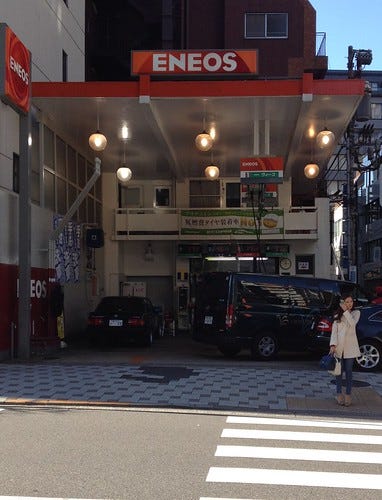 You may have noticed you can't see any pumps on the ground and that is because there aren't any. Look up though and you'll see them dangling down by the smaller Eneos sign. They are lowered to you once you have parked. Parking itself is at a premium so a lot of places have multi-story parking by which I mean you park on the ground floor and a mechanism then stacks your car on top of another one with just an inch or two between them. You get a ticket and when you scan the paid ticket later the mechanism trundles your car back to you. This was a huge skyscraper so large it had a ring road inside it which had a version of this parking.