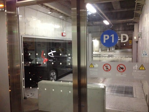 You park your car in the perspex bay and it trundles into the wall cavity on rails. It gets whisked below the building somewhere and I mean b.e.l.o.w. Most of these large buildings have 4 basement levels so I can only guess how far down the cars are kept. All to minimise the space they take up.