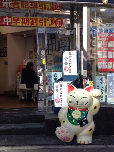 It is all, naturally, a little bit different to what I'm used to but I'm getting used to it. Characters play a large part in most shop windows and some have physical representations of their icons or of something more traditional like the lucky cat - my favourite! This one is outside a photography shop on the corner.