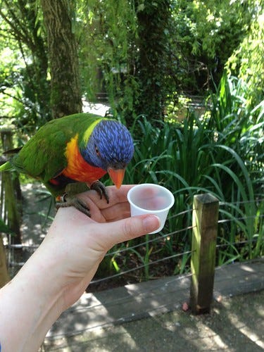This is what my colleague and I were singing on Tuesday when we left the office. We were on our way to Bristol to go to the zoo...for an event I had organised. It went really well and was structured such that we both got the occasional half hour to sneak off. I got bitten by a Lorikeet.