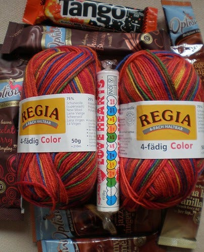 Then the nom's and some yarny goodness. The lovehearts were the 'local' item as they are made near her.