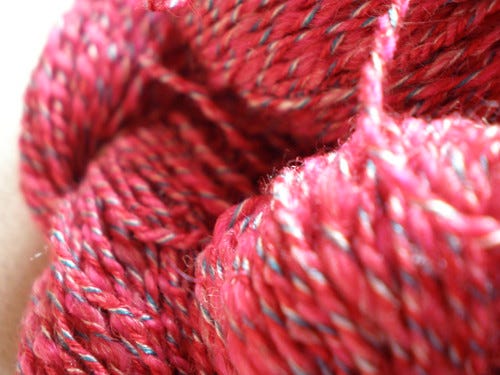 I played with the colour settings on my laptop so the photo above probably looks a bit fake but I was trying to show the actual colour of the handspun silk plied with silk that is just so darn awesome I don't really know what else to say. And talk about timely. I'd been looking for a yarn to knit into a shawl to wear with the dress I'm donning for Nickerjac's wedding. And lo! This matches it perfectly. Close up: