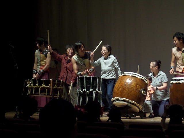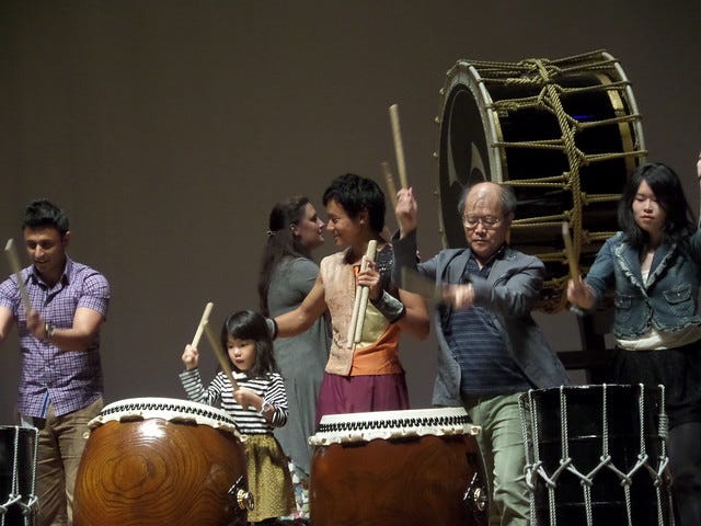 The concert itself was played by the five guys there who had the most amazingly toned arms I've ever seen. Photos were not allowed so I can't share, but they didn't just sit about and whack them with sticks. There was real dynamism in their performance and at one point four of them were lined up with drums in front of them and were playing each others drums and rippling the strikes back and forth along the line - it's hard to describe but it really was amazing. And quite sexy, as a french neuro-surgeon, also part of my eclectic group of watchers, put it in his equally sexy accent. As I told the Meetup's organiser afterwards, it is so brilliant to have the opportunity to come along to these things - especially as a government grant meant we had got in free. I am getting better at using google translate to google for things in japanese but I still mostly search for events in english and never would have found out about this one without the meetup group.