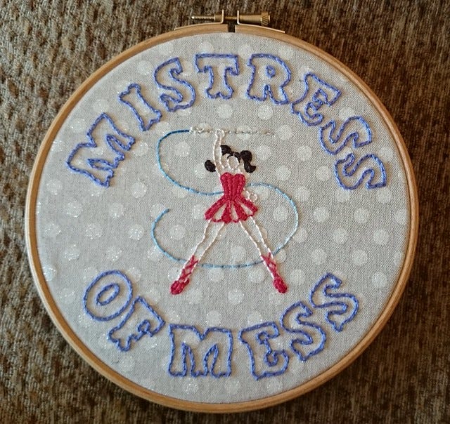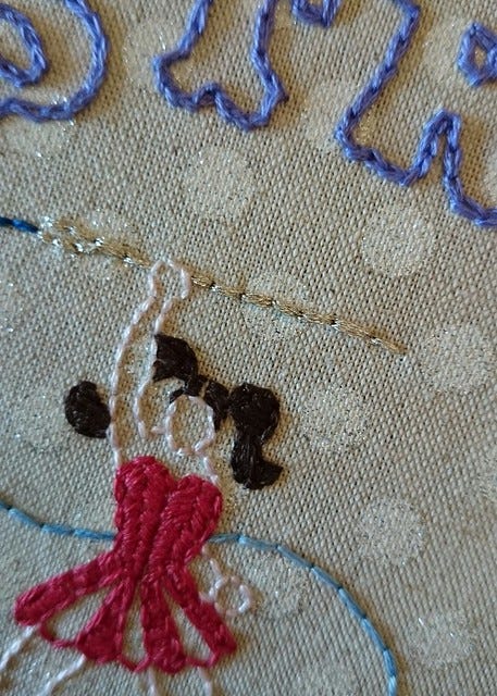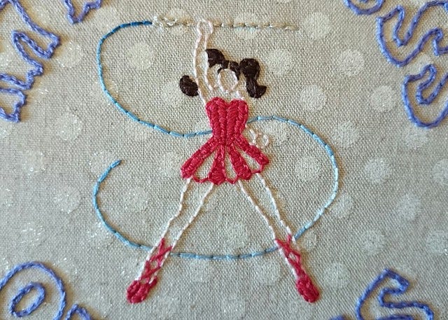 I mixed chain stitch outlines on the letters with a running stitch outline of the limbs and a kind of messy satin stitch on the hair, dress and shoes.