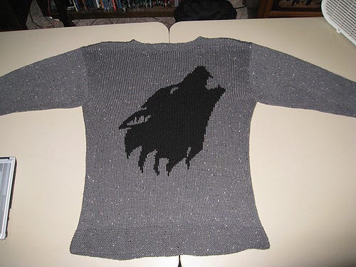 He's from Canada and it can get very cold up there, so I think a chunky jumper. And in keeping with that gothic vibe he's got going on, let's make it the Big Bad Wolf Pullover from Domiknitrix. Incidentally, I do like that book. Great how-to section which I've used for other projects, as well as the actual patterns.