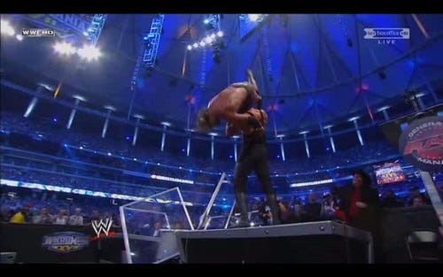 The Commentators speculated that he might have "shattered some internal organs". Whereupon he gets up and does more or less the same back again. Or when the taller guy (The Undertaker) rebound of the rope and dives headfirst over the top rope in order to nut his opponent (Triple H).