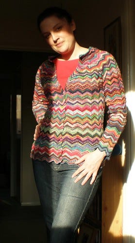 And what to do while watching wrestling? Why, what else but knit. For the sock yarn leftovers cardi is almost finished.