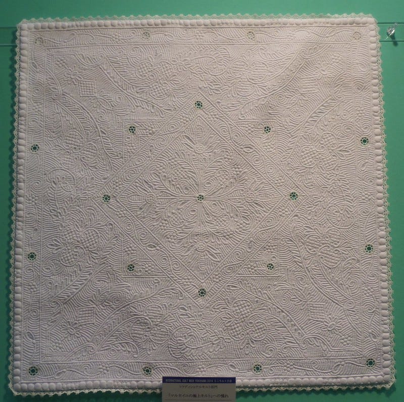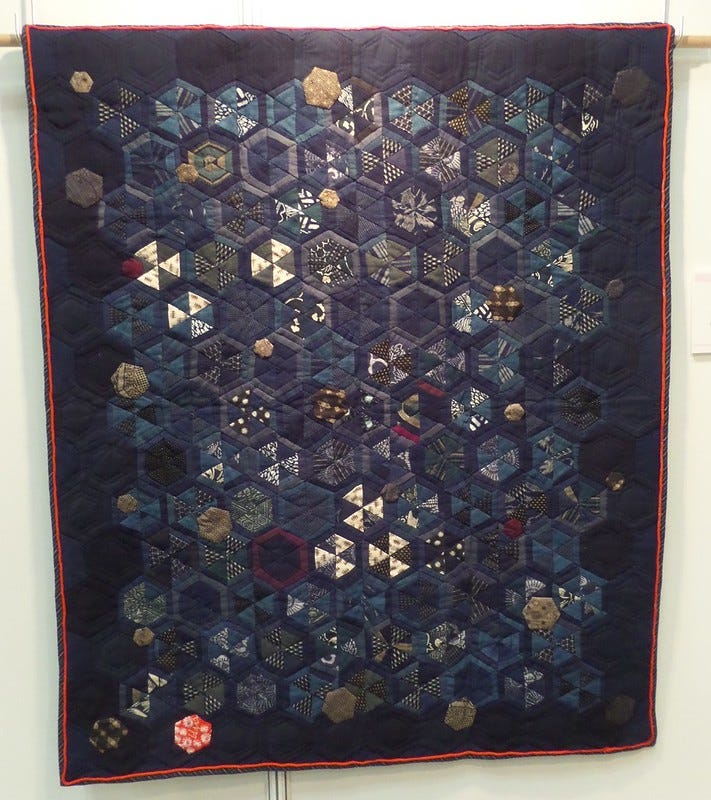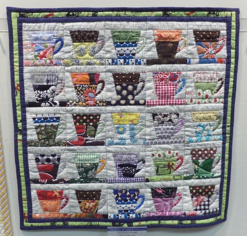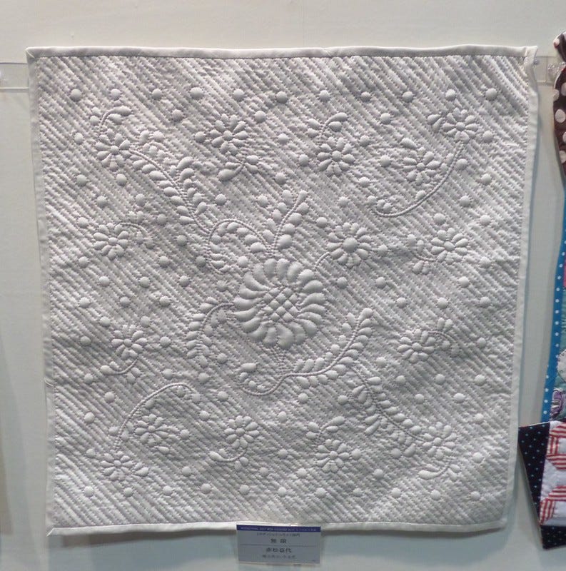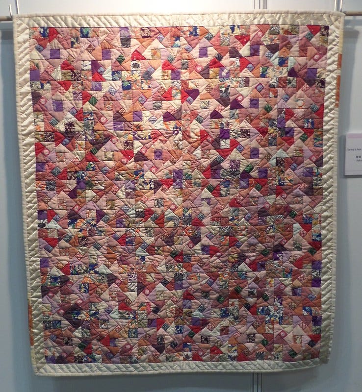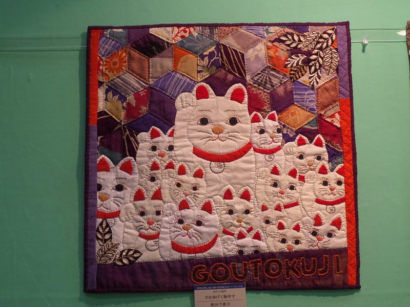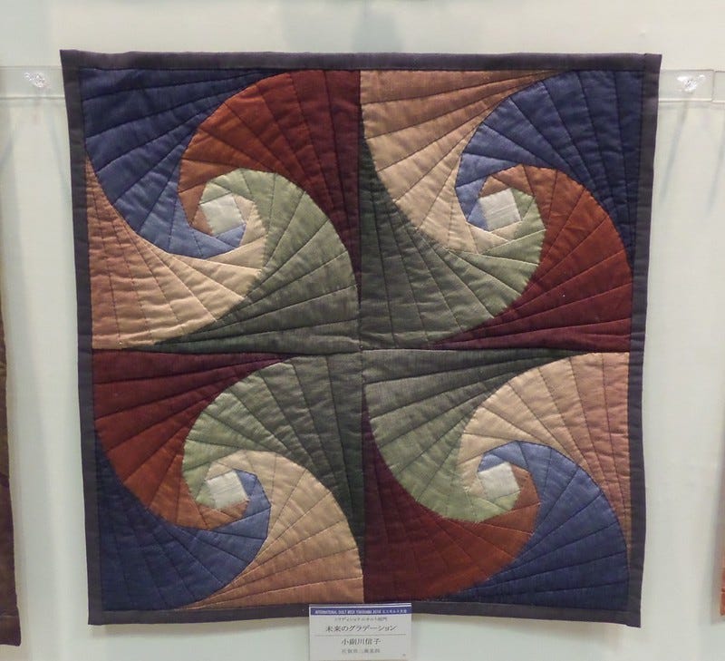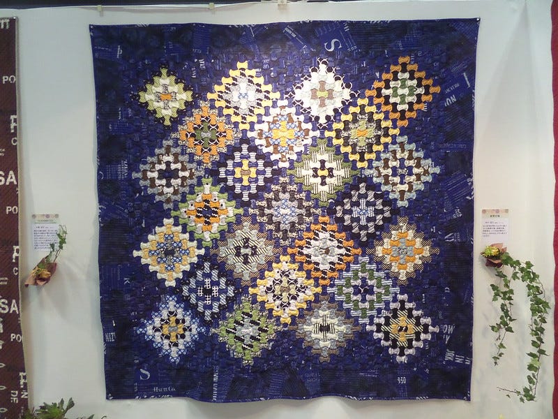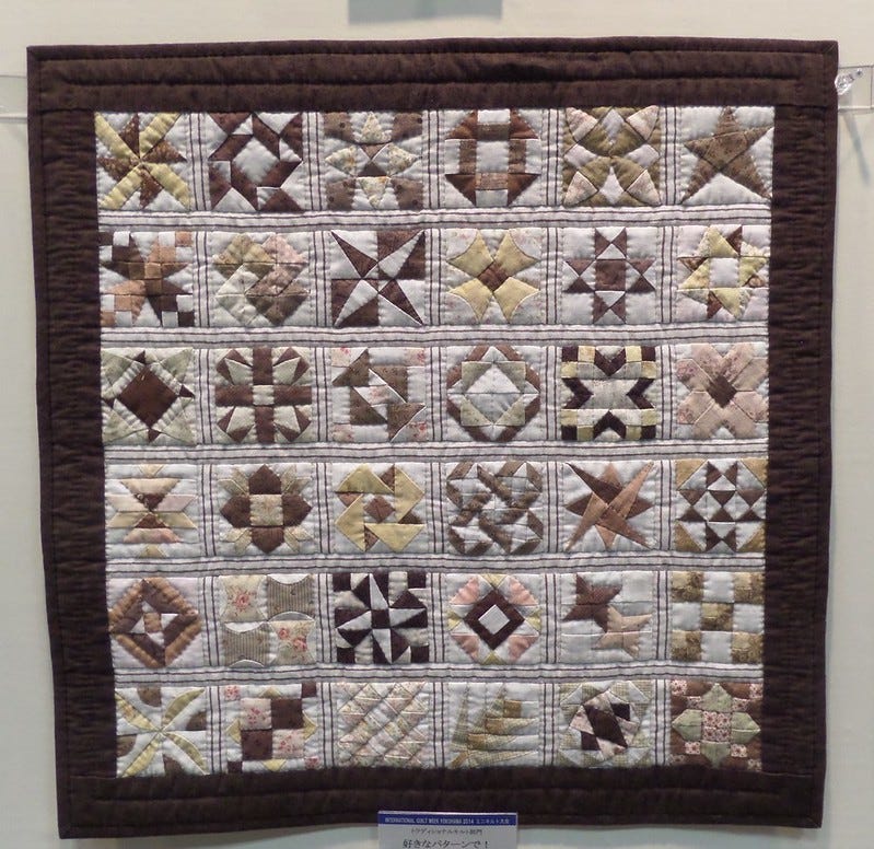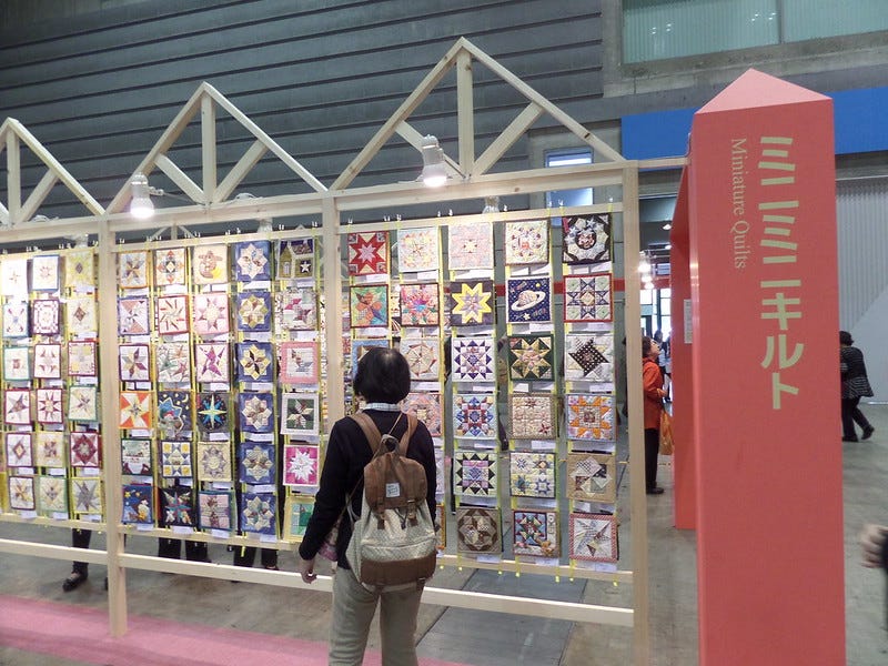 Yesterday's post got us through the majority of the full size quilts (although a few more to come) and left me at the start of the the "Small Quilt" section. I checked (yep, got out my tape measure and measured one hanging there) and these were all 50x50cm. No attribution with these ones I'm afraid as the smaller labels were all in Japanese.