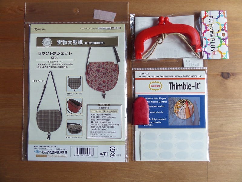 Then I did buy one of those bright plastic purse frames. I also got a bag pattern from Olympus (just the pattern - not a kit) and a few attempts to save my sore fingertips when I am hand sewing.