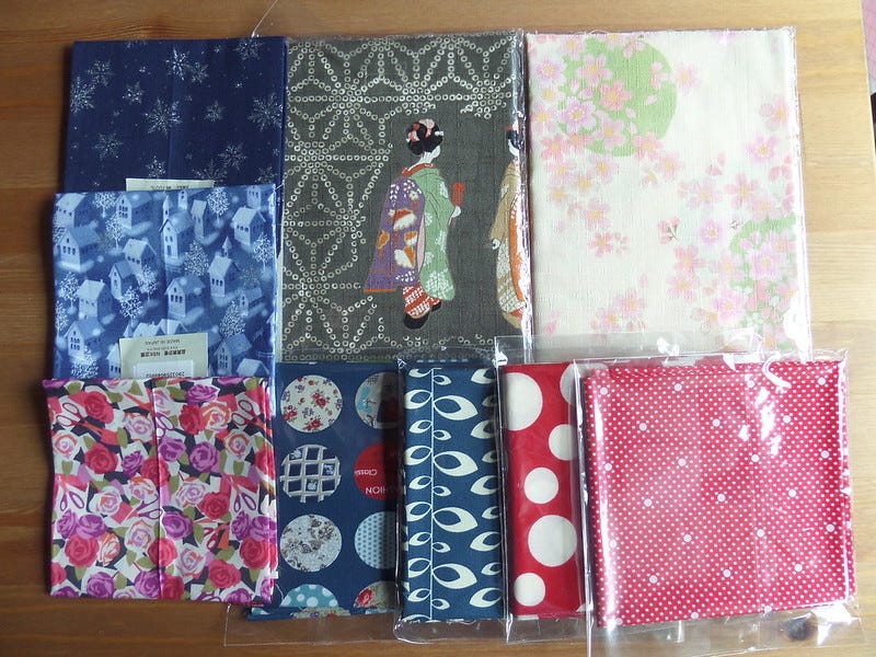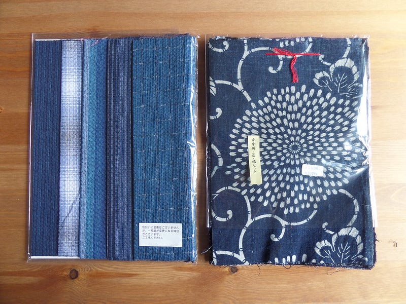 On the left is a pack of woven, textured cotton from one of the Southern Islands of Japan (I think a lot of people think of Japan as just being one island but it's actually quite a few, some not even that close to the main bit that Tokyo is on). On the right is a pack of woven and indigo remnants. I was deliberately on the lookout for 'japanese blues'.
