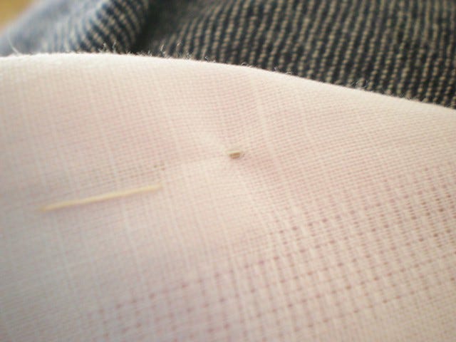 The Sensai (just like Karate Kid) taught us two stitches - one for finishing hems and one for hemming edges. The seams around the arm holes on the sleeve and the bottom hem were done with the latter, which looks like this on the outside (I've left the needle in so you can see the stitch):